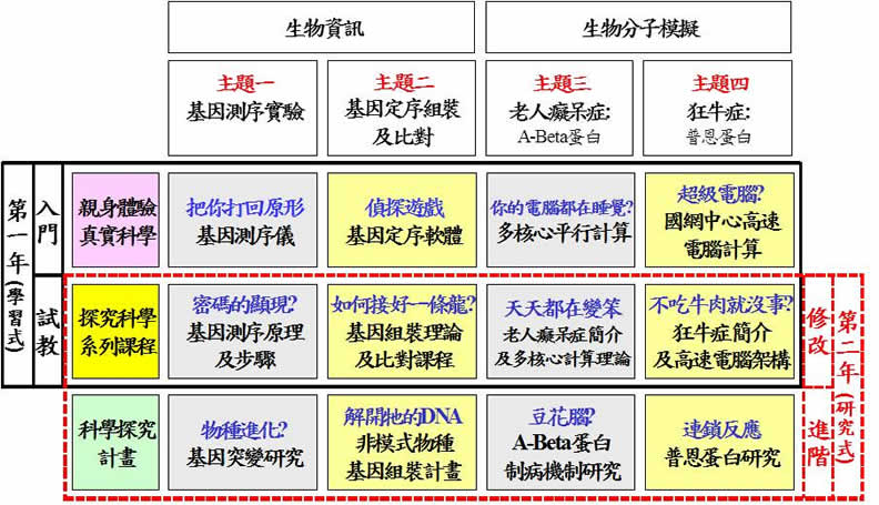 •計算生物學大致可分為兩大領域,其一為生物資訊範疇,包含基因體、基因序列組合比對、種族樹的建立等課題;另一則為分子理論模擬的部分,主要進行蛋白質三維結構的預測,此乃由於蛋白質的很多特性與功能是與其實際的三維結構相關,故可以用以解釋各種生化反應。簡單來說,生物資訊可以讓高中生體會與基因相關的各種研究課題,包含基因定序實驗與序列分析比對計算,而蛋白質的分子模擬部分可以提供一個結合物理、化學及生物學的整合性理論科學,讓高中生能夠提早感受理論研究的另類魅力。