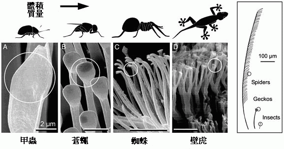 結合分子黏著與接觸力學理論,在對生物表面結構的廣泛研究中,顯示出動物具有 6 種不同末端元件的尺度效應